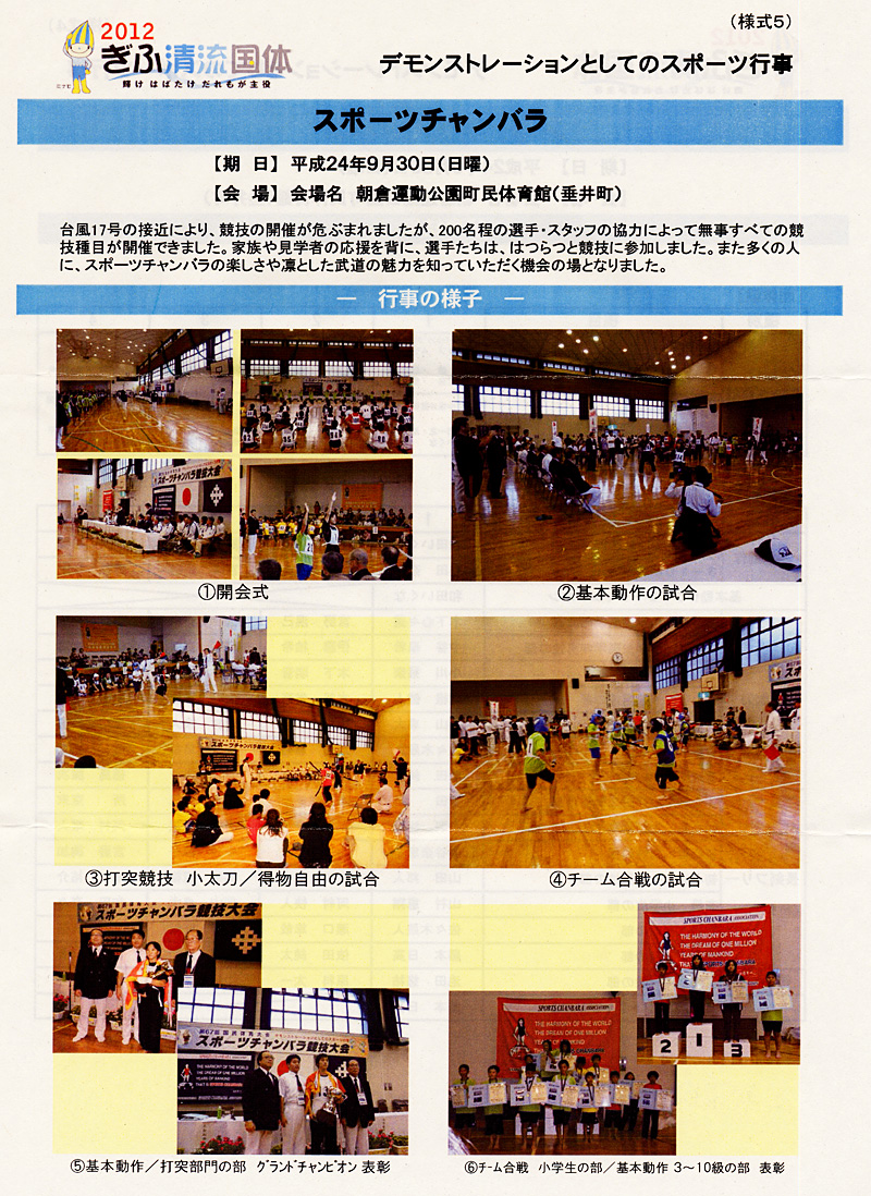 2012ぎふ清流国体 デモスポ行事 スポーツチャンバラ大会 2012年09月30日 於:朝倉運動公園町民体育館(垂井町) 基本動作グランドチャンピオン 和田いくな打突競技グランドチャンピオン 藤本日高おめでとうございます! 平成24年9月30日(日)、朝倉運動公園町民体育館(垂井町)に於きまして、2012ぎふ清流国体デモスポ行事 スポーツチャンバラ大会を実施いたしました。 【関連記事】 大会結果(jpg) 大会写真